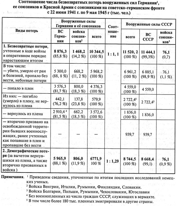 Если принять на веру официальную цифру 8 744 тыс. человек, то доля наших военных потерь составит 25 процентов. То есть, по утверждению комиссии Министерства обороны РФ, лишь каждый четвертый советский солдат и офицер не вернулся с фронта.